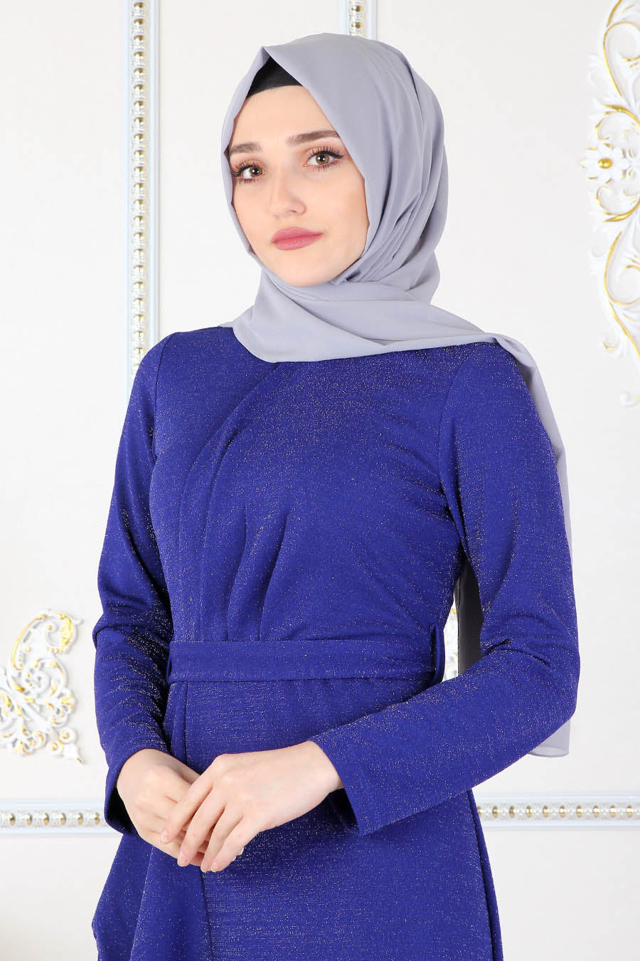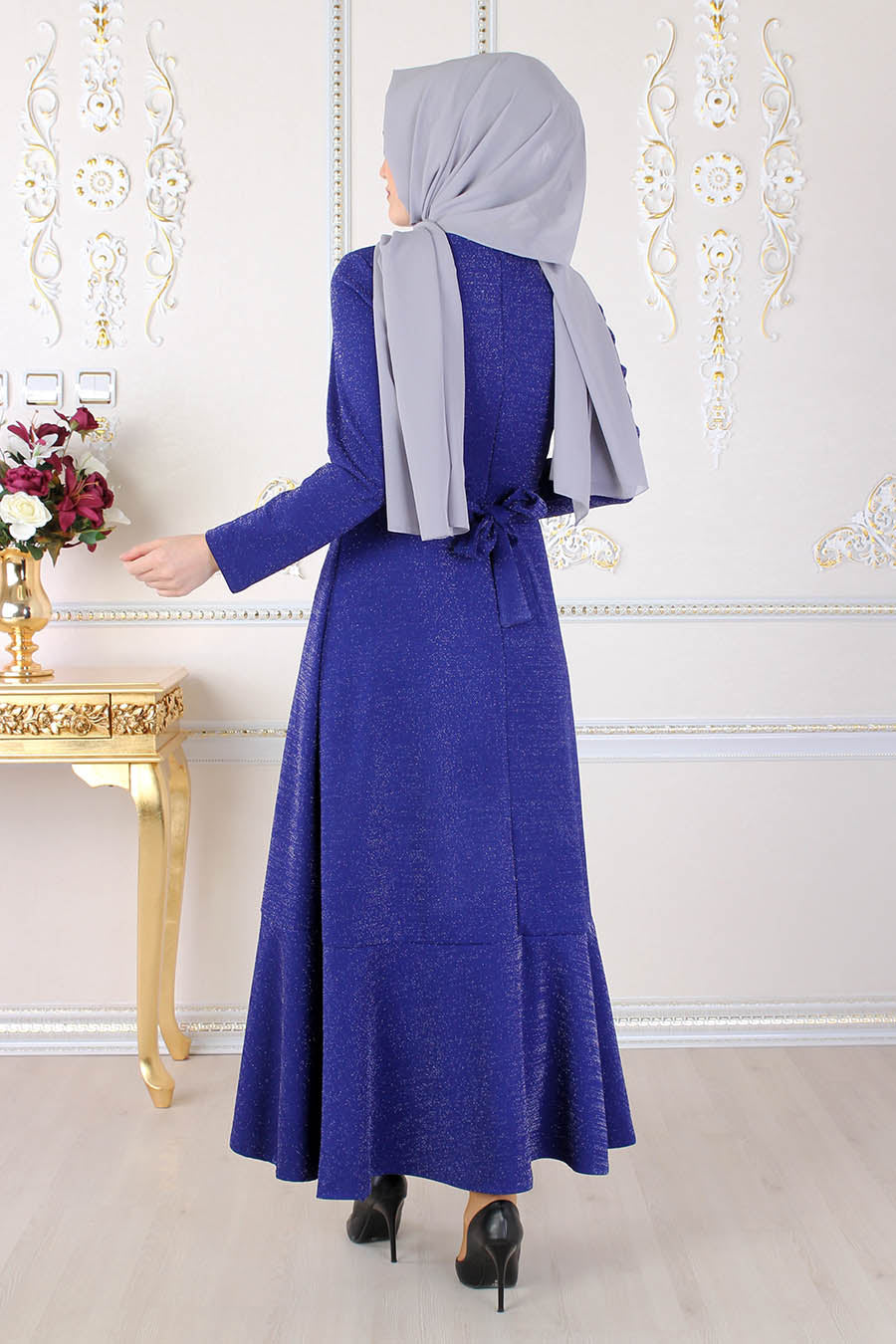 Royal Blue flouncy flared abaya adorned with sparkly silver. A tied waist, and beautiful all-over drapery. Fabric: Polyster - enables strength and durability. Light weight of the fabric keeps the condition better for longer use.