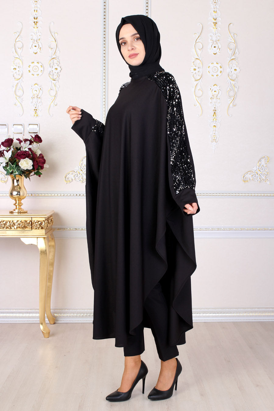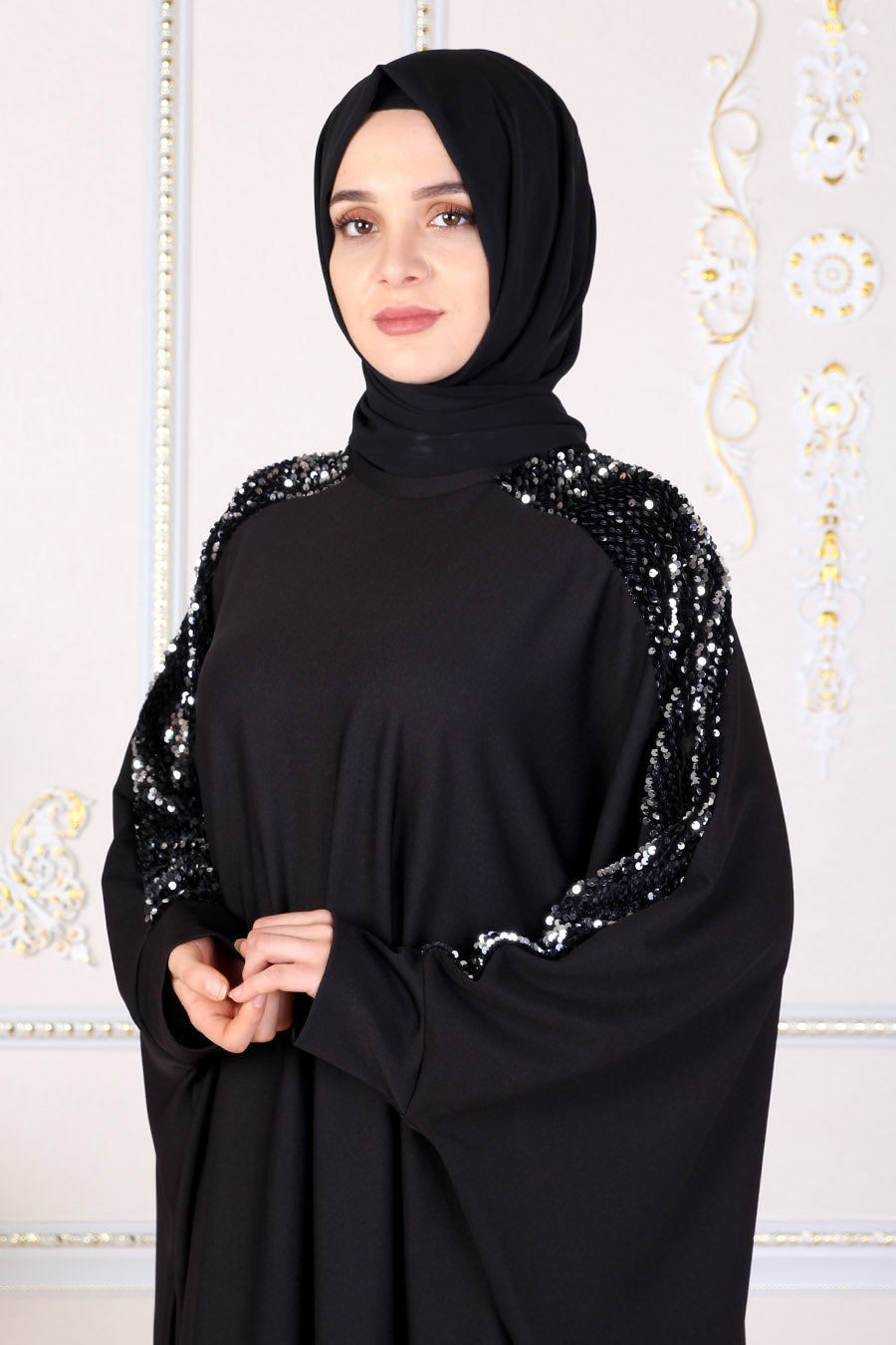 Sequin detailed black Abaya. Fabric: Polyster - enables strength and durability. Light weight of the fabric keeps the condition better for longer use. Product Length: 130 cm