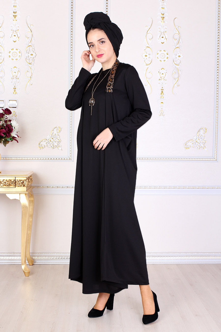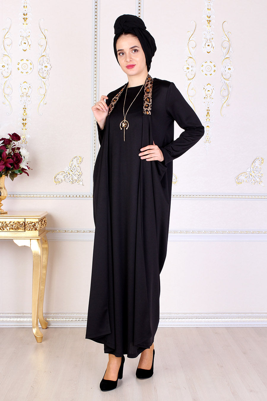 Black Modest Dress W/ Leopard Print Straps - Buy Abaya Online