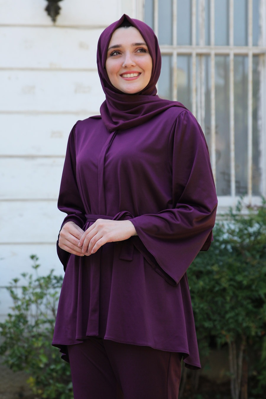 Purple Matching Tunic and Trouser Set featuring a waist belt.